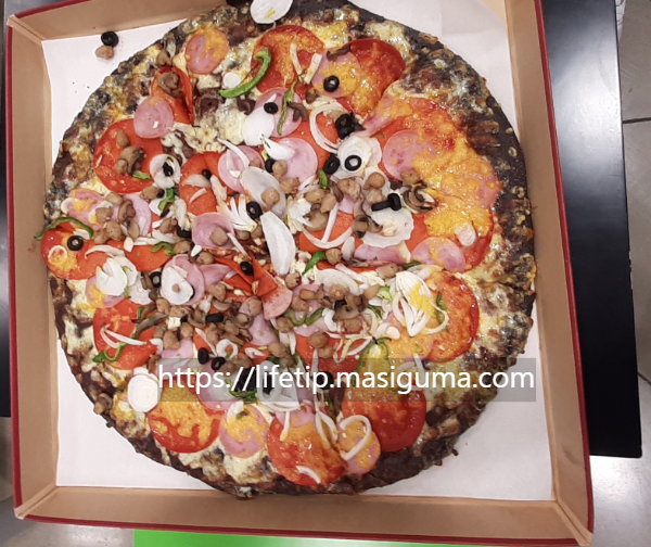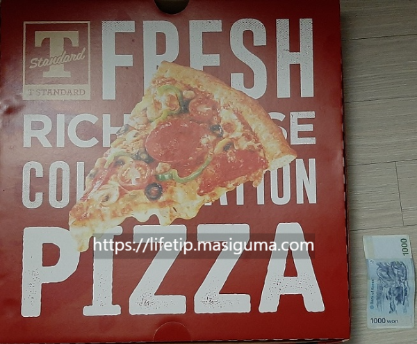 트레이더스의 피자 크기는 매우 큽니다. 크다. 그리고 다른 피자와는 다르게 피자 도우가 검습니다. 천 원짜리 지폐와 비교해 보았습니다.