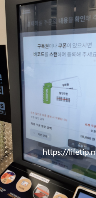 '구독권이나 쿠폰이 있으시면 바코드를 스캔하여 등록해 주세요'라는 화면이 나왔습니다. 구독권 뒷면에 있는 바코드를 바코트 리더기에 가까이 대주시면 등록이 됩니다.