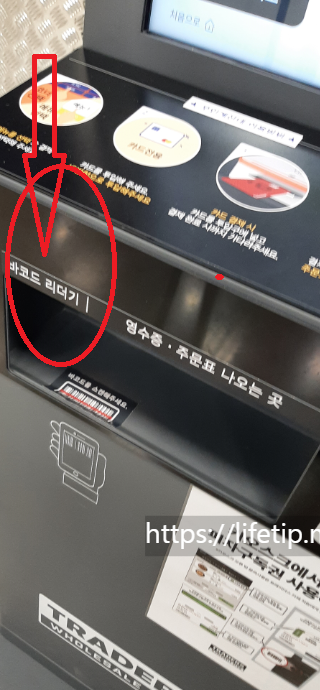 쿠폰 뒷면을 보시면 빨간색 네모 위치에 바코드가 있습니다. 그 부분을 바코드 리더기 아래에 대시면 입력이 됩니다.