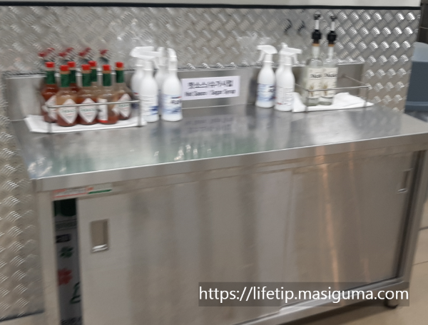 푸드코트에 있는 여러가지 편의 시설을 알아보겠습니다. 푸드코트에는 피자나 음식을 먹을 때 필요한 접시나, 포크, 소스통이 준비되어 있었습니다.