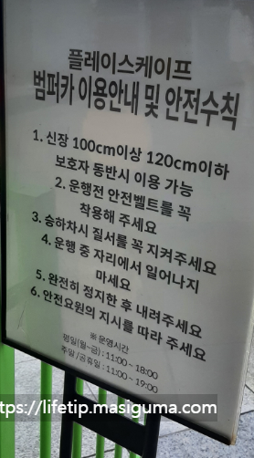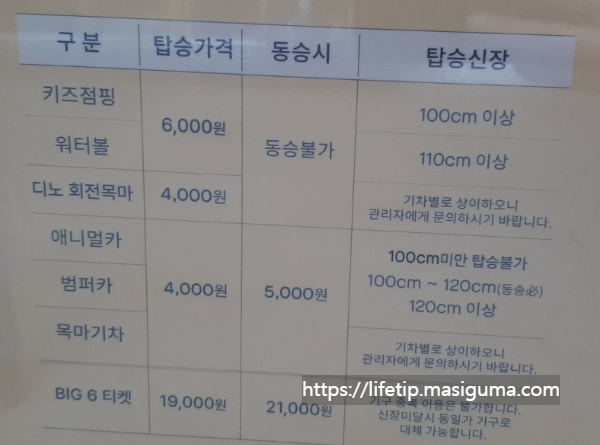 키 110cm 이상이어야 이용가능하며, 요금은 6000원입니다. 동승은 금지됩니다.