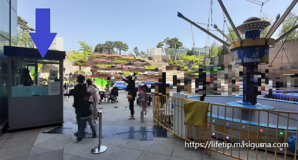 매표소는 키즈점핑 바로 옆에서 현장 구매하시면 됩니다. 아래 사진에서 파란색 화살표 부스입니다.