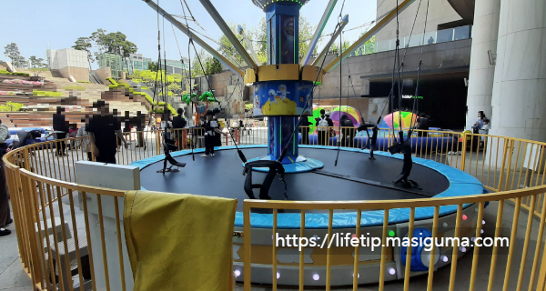몸에 안전장치를 단 후, 천천히 회전을 하며 점프를 하는 놀이기구 입니다. 아이들이 신나게 점프를 합니다