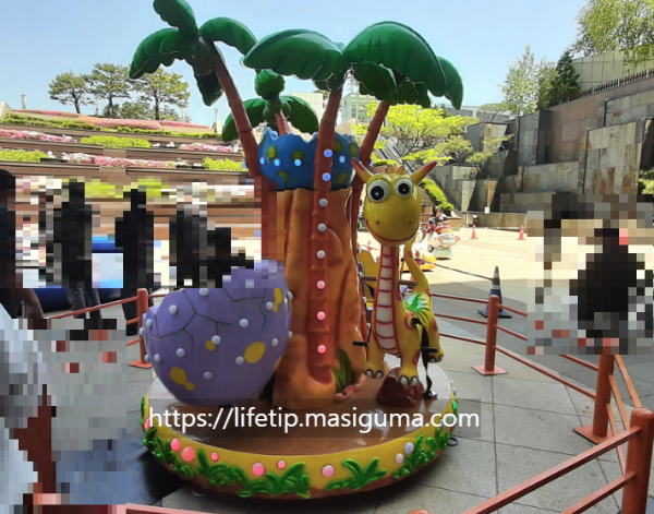 빙글빙글 도는 회전목마입니다. 공룡 모양 목마를 탈지, 알 모양 목마를 탈지에 따라 필요한 키가 다릅니다. 안내 요원이 있어서 안전한 열차를 타도록 도와줍니다. 요금은 4000원입니다. 동승은 할 수 없습니다.