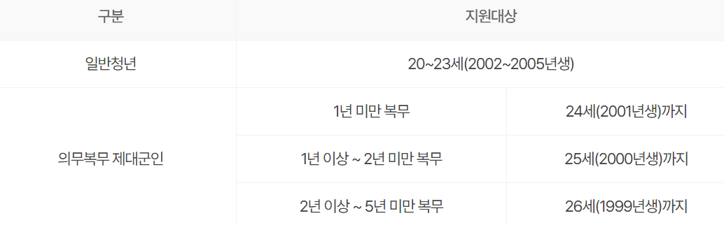 대상 자격은 20세부터 23세의 청년입니다. 생일이 2002년 1월 1일부터 2005년 12월 31일 사이인 청년이 대상입니다.