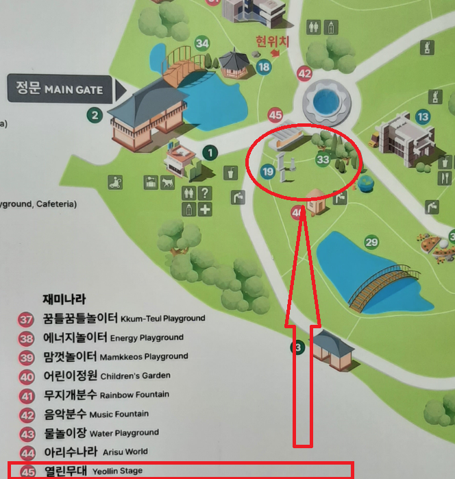 물놀이장 위치를 좀 더 확대해보겠습니다. 열린 무대(45번) 앞 공터가 물놀이장입니다.