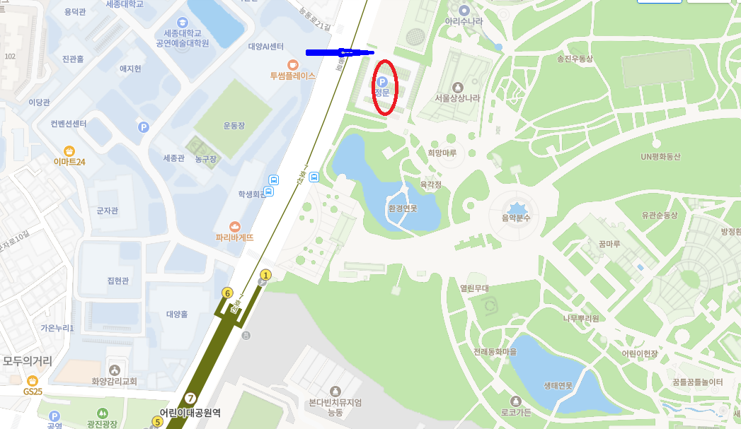 물놀이장은 서울어린이대공원(능동로 216) 안에 있는 열린 무대 앞에 있습니다. 아래 지도에서 빨간색 동그라미 부분이므로, 어린이대공원 정문으로 입장하셔야 가깝습니다.