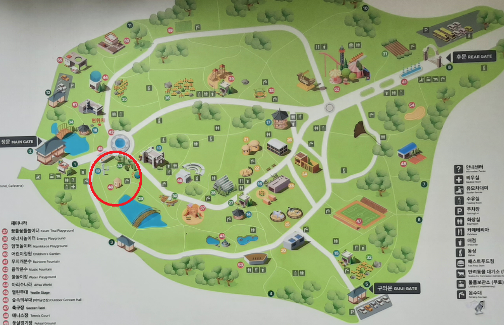 어린이대공원 전체 지도는 아래와 같습니다. 빨간 원 부분이 물놀이장 위치입니다.