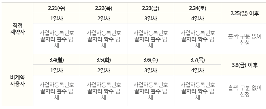 예를 들어 자신의 사업자번호 끝이 '1'이라면 홀수 이므로 1일 차와 3일 차에 신청이 가능합니다. 5일 차부터는 구분 없이 신청 가능합니다.