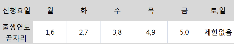 생년 끝자리 기준으로 신청 요일이 다릅니다.