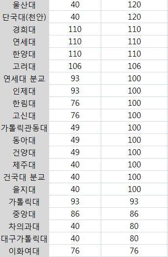 성균관대 80명, 아주대 80명, 차의과대 40명, 가천대 90명, 인하대 71명이 추가 배정되어 총 361명이 추가 배정되었습니다. 지금까지 각 대학이 보통 40명 정도를 선발해 왔었는데 120명 가까이 선발합니다. 성균관대, 아주대, 인하대가 120명을 선발하고, 차의과대학이 80명, 가천대가 130명을 선발합니다.