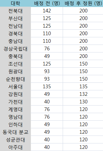 원관대가 57명이 추가되어 150명, 전북대가 58명이 추가되어 200명을 선발합니다.