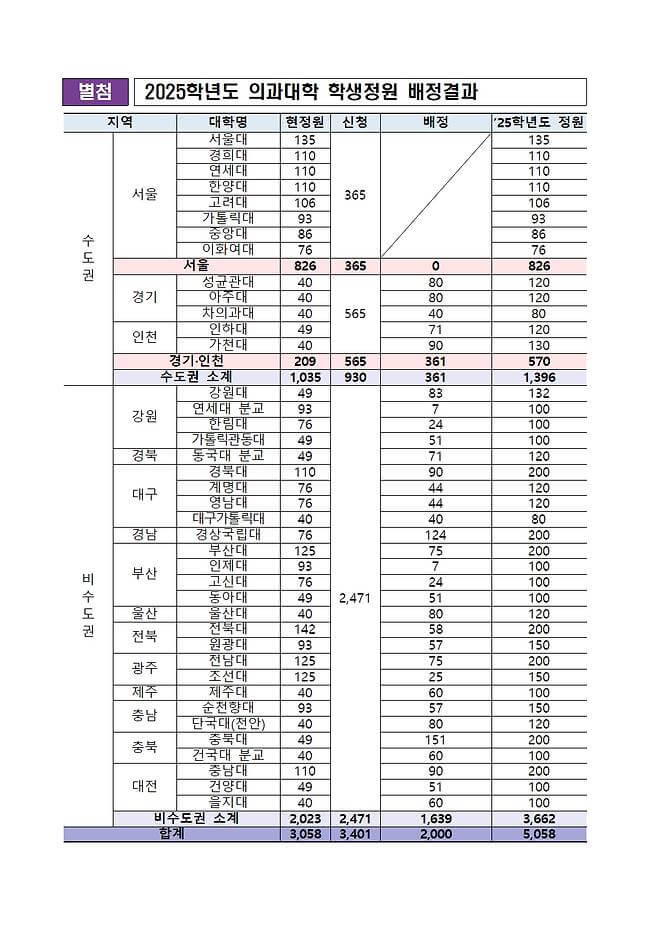 결론적으로 서울권 대학에는 1명도 추가되지 않았고, 경기도와 인천지역에는 361명이 추가되었습니다. 그리고 나머지 1639명이 지방 의대에 배정되었습니다.