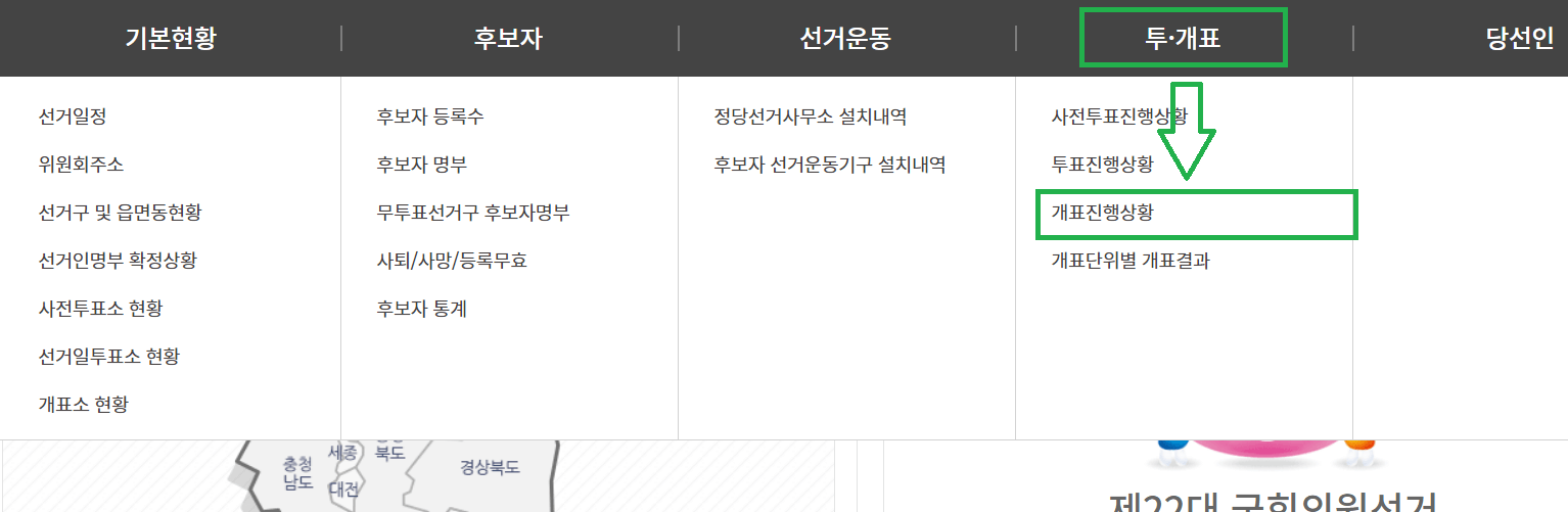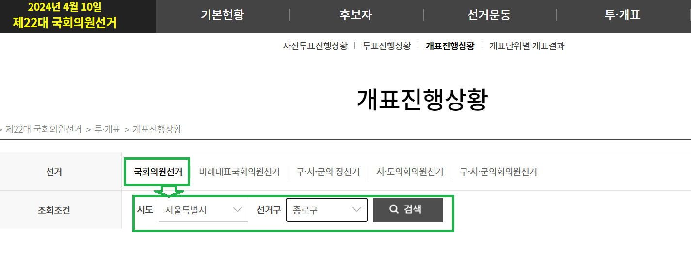 또는 아래와 같은 화면이 나올 수도 있는데, 그런 경우는 아래 녹색네모의 '개표 진행상황'을 클릭합니다.