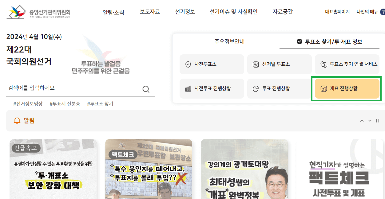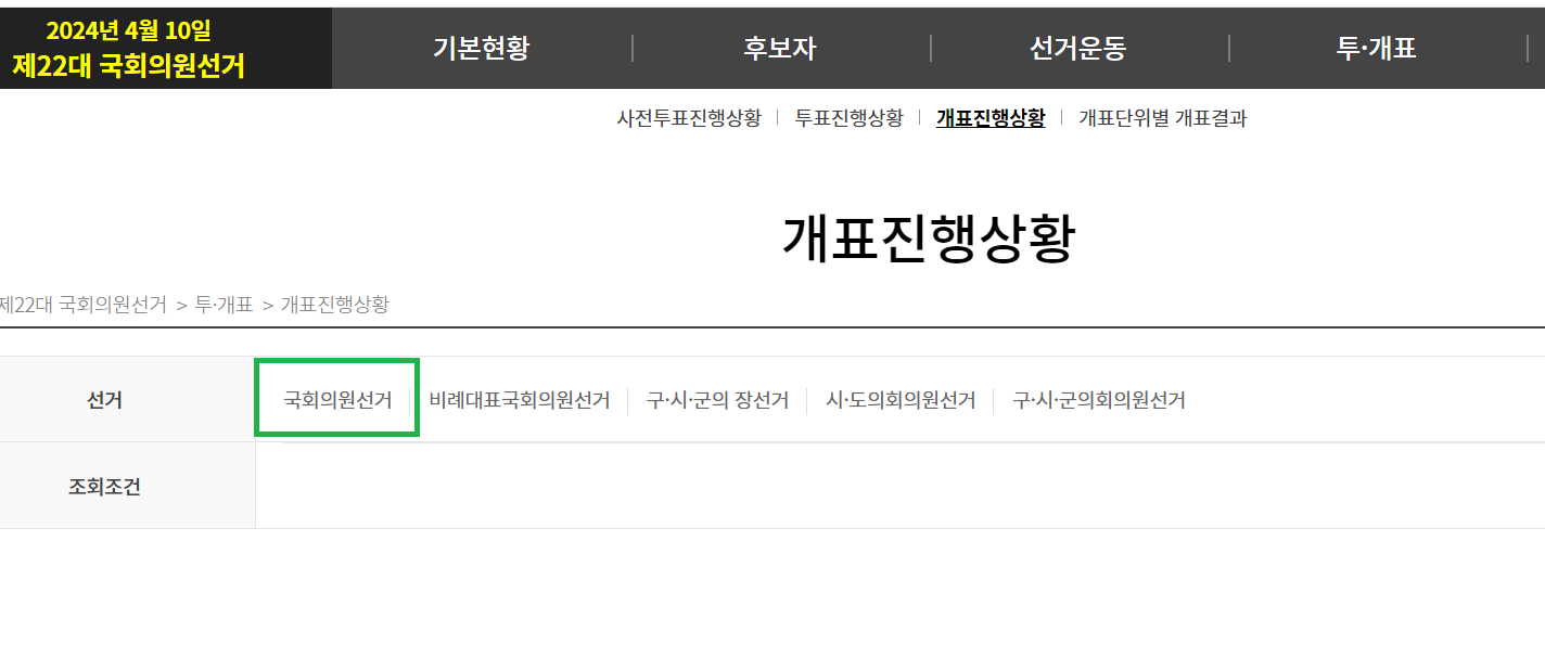 또는 아래와 같은 화면이 나올 수도 있는데, 그런 경우는 아래 녹색네모의 '개표 진행상황'을 클릭합니다.