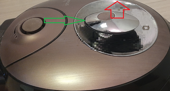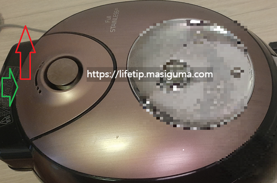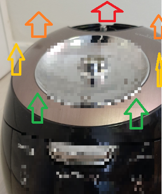 밥솥 뚜껑 손잡이를 분리합니다. 녹색 화살표 부분을 누르면서, 빨간 화살표 방향으로 당기시면 분리됩니다.