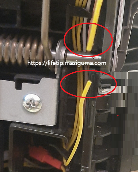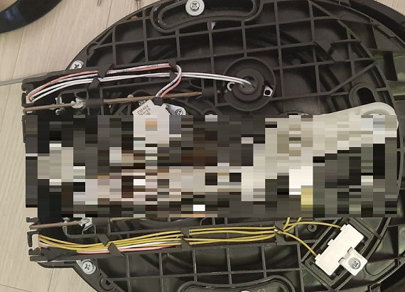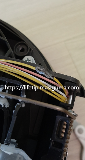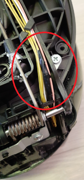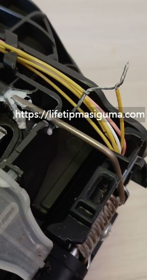 플라스틱 판까지 분리하셨다면 아래 사진처럼 전선이 보입니다. 저 전선 중 끊어진 전선이 있을 것입니다. 전선이 더 윗부분이나 아래에서 끊어졌다면, 여기서 보이지 않을 수도 있습니다.