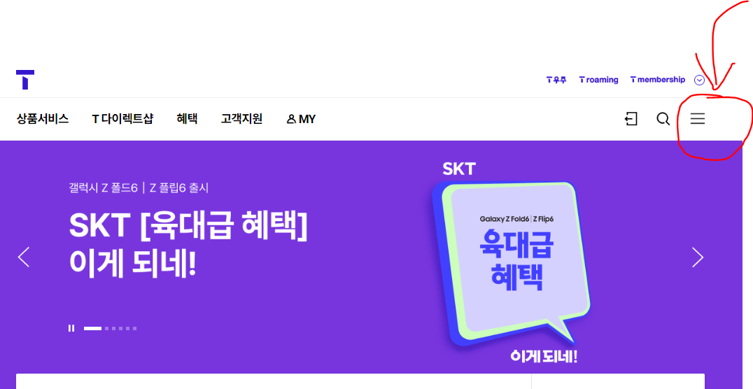 2-2. 로그인 후 화면의 가장 오른쪽에 (선 3개) 메뉴를 클릭합니다. (화살표)
