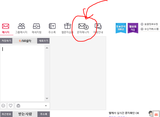 빨간 원 안의 문자매니저를 클릭해 주세요.