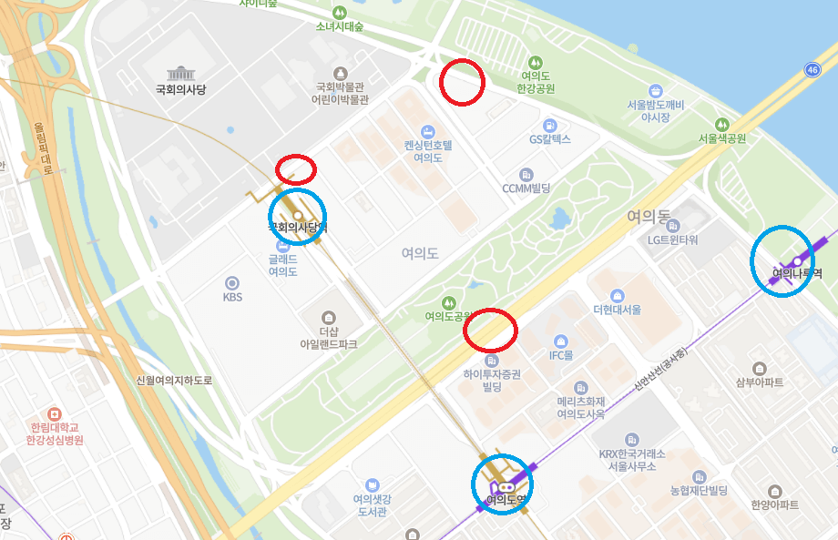 빨간색 원이 버스 정류장이고, 파란색 원이 지하철입니다.