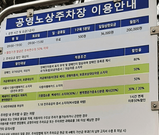 여의도 공원 바로 옆에 붙은 작은 공영주차장입니다. 5분당 500원이며 일일 상한 요금은 36000원입니다.