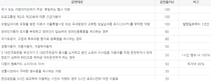 국가유공자 할인(80%), 경차 할인(50%), 다둥이행복카드 할인 등이 적용됩니다.