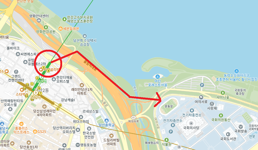 - 당산역 4번 출구 : 도보 15~20분 거리. 늦은 밤 한강의 분위기는 매우 좋기 때문에 지루하지 않다.
