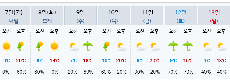 만개 시기를 알았다면 언제 벚꽃이 끝나는지 궁금해집니다. 벚꽃은 보통 강한 바람과 비가 동반하는 날이 지나고 나면 모두 떨어지게 됩니다. 그러므로 여의도의 날씨를 살펴보겠습니다.