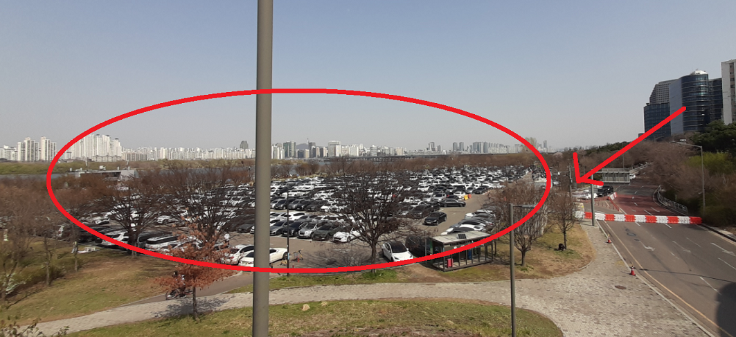 그렇다면 남는 주차장은 빨간색원 주차장과 녹색원 주차장인데, 녹색원 주차장은 거리가 있어서 이용하기가 어렵습니다. 그러면 빨간색 주차장만 남습니다. 행사장과 가까운 빨간 주차장(초원아파트 위 주차장)은 쉽게 만차가 되는 것을 염두에 두셔야 합니다. 제 경험상 점심 정도까지는 자리가 있었지만, 늦은 오후시간이 되면 만차가 되는 것 같았습니다.