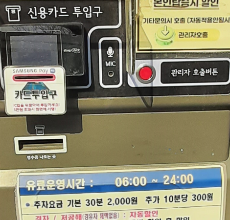 주차비는 기본 30분에 2000원, 추가 10분당 300원입니다. 경차, 저공해차는 할인이 됩니다. 경유차는 대상이 아니라고 하네요.