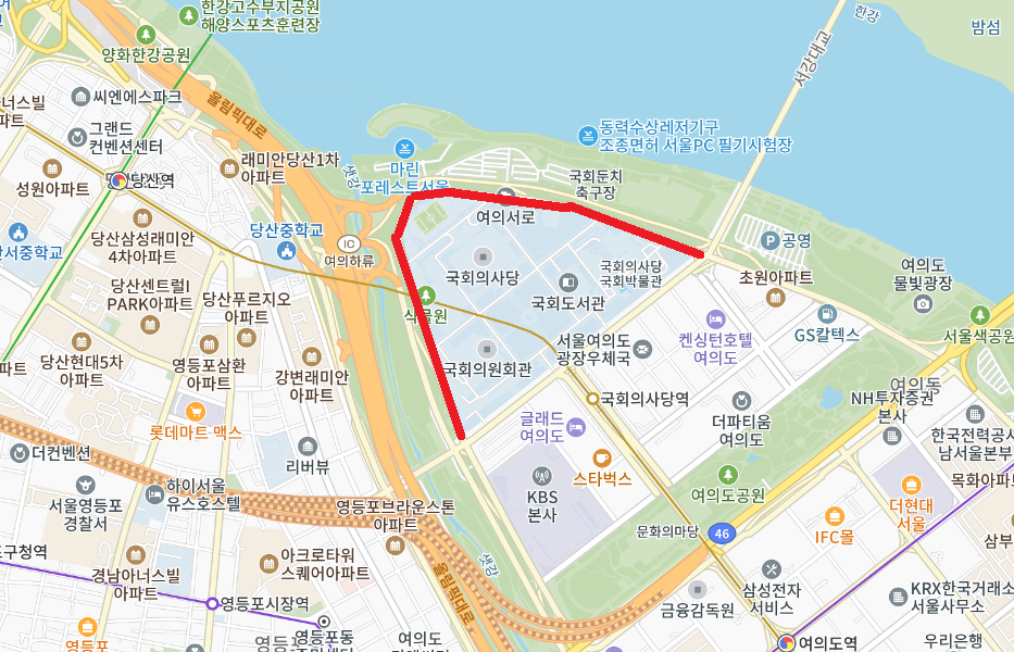 장소는 여의도 윤중로입니다. 여의도 서쪽 부분이고, 국회의사당을 둘러싼 지역입니다. 아래 지도에서 빨간색 선 부분이 행사 장소입니다.