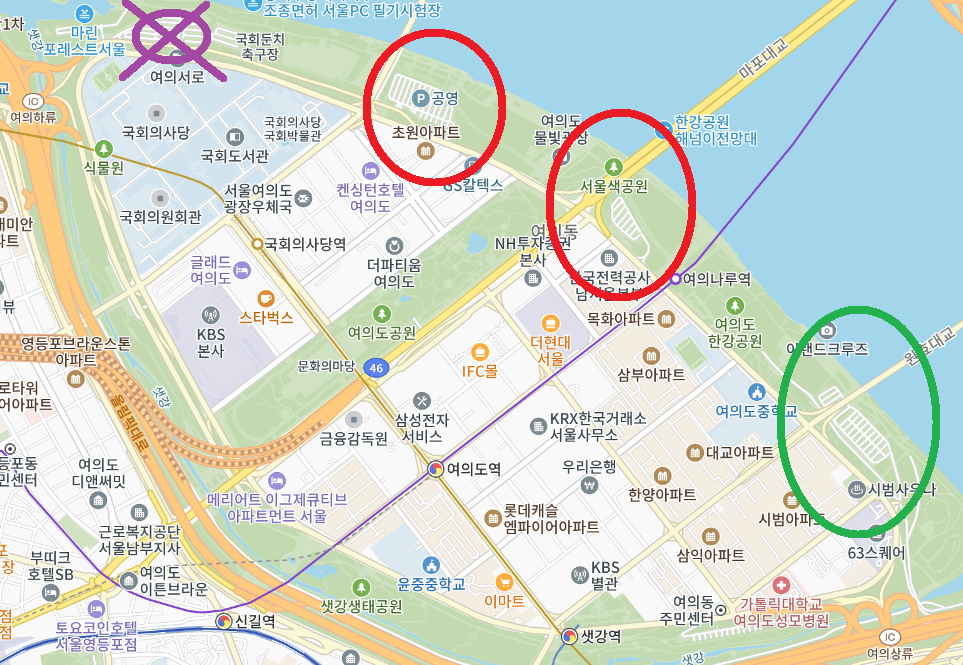 - 여의나루역 2번 출구 : 도보 15분 거리. 가는 동안에도 벚꽃이 매우 많다. 가는 길에 여의도 공원도 볼 수 있다.